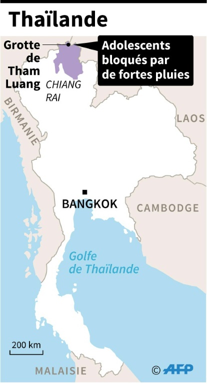 Les 12 garçons, membres d'une équipe de football, âgés de 11 à 16 ans, sont entrés dans la grotte de Tham Luang, située près de la frontière avec la Birmanie et le Laos, après leur entraînement de football samedi. "L'eau à l'intérieur de la grotte est très boueuse et il y a peu d'oxygène", a précisé le gouverneur de la province de Chiang Rai, Narongsak Ossttanakorn, lors d'un point presse devant la grotte.