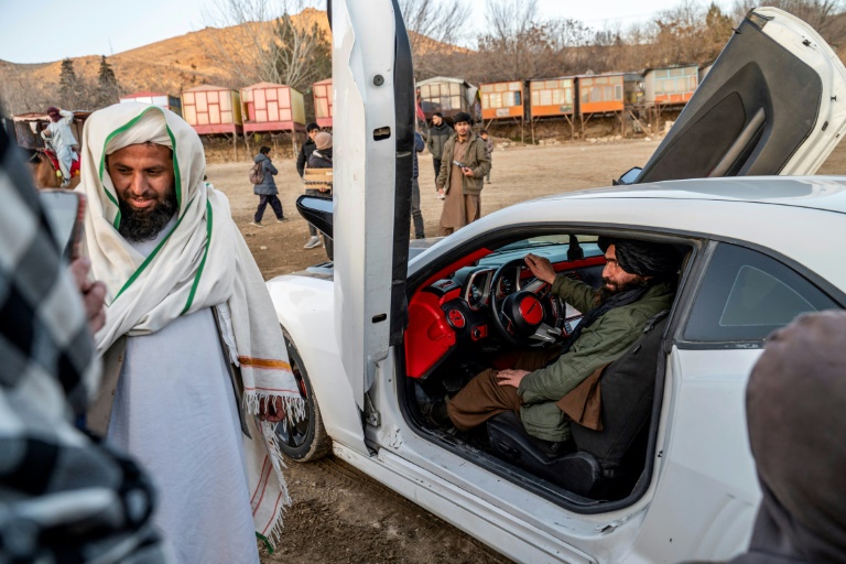 Là, des cavaliers et de jeunes mendiants se sont rassemblés pour regarder, ainsi que des talibans qui se prennent en photo auprès des voitures, kalachnikov à l'épaule.