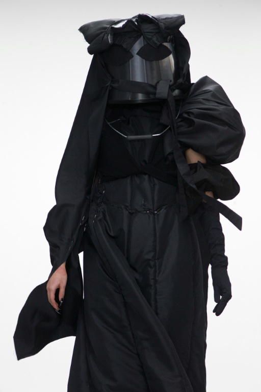 Avec un seau noir, porté à l'envers directement sur la tête et recouvert de larges bandes de tissu, le créateur invente une combinaison futuriste qui n'est pas sans rappeler le "Dark Vador" de "Star Wars", et parvient à surprendre un public pourtant habitué des défilés en tous genres.