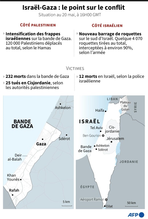 De leurs côtés, le Hamas et le Jihad ont lancé plus de 4.300 roquettes vers Israël, des tirs d'une intensité inégalée contre l'Etat hébreu, qui dispose d'un bouclier antimissile ayant permis d'intercepter 90% de ces projectiles. Les affrontements ont fait au moins 232 morts côté palestinien, dont 65 enfants et de nombreux combattants du Hamas et du Jihad islamique, et 12 morts en Israël --dont un enfant de six ans, une adolescente de 16 ans et un soldat.