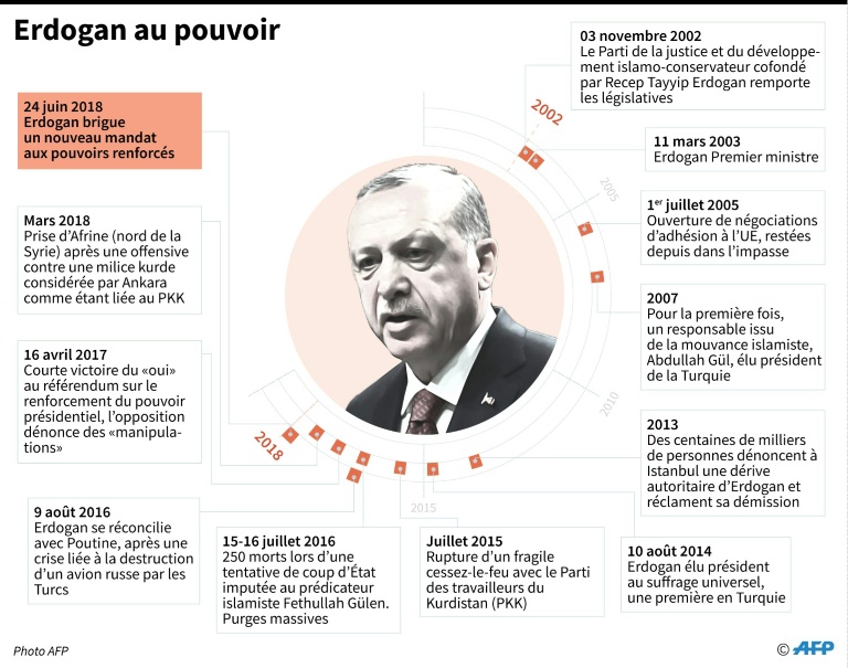 M. Erdogan, 64 ans, dirige la Turquie depuis 2003, d'abord en tant que Premier ministre puis en tant que président depuis 2014. Il l'a transformée à coups de projets de développements et en mettant en oeuvre des politiques tournées vers la croissance économique, tout en libérant le champ d'expression religieuse dans ce pays musulman et en s'imposant comme un acteur-clef sur la scène internationale.