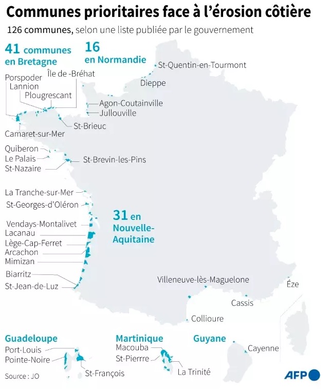 La majorité sont situées sur les côtes atlantique et de la Manche (notamment 41 en Bretagne, 16 en Normandie, 31 en Nouvelle-Aquitaine). "Ces 126 soi-disant prioritaires sont ridicules par rapport aux 864 communes menacées", regrette auprès de l'AFP Elodie Martinie-Cousty, de l'ONG France Nature Environnement.
