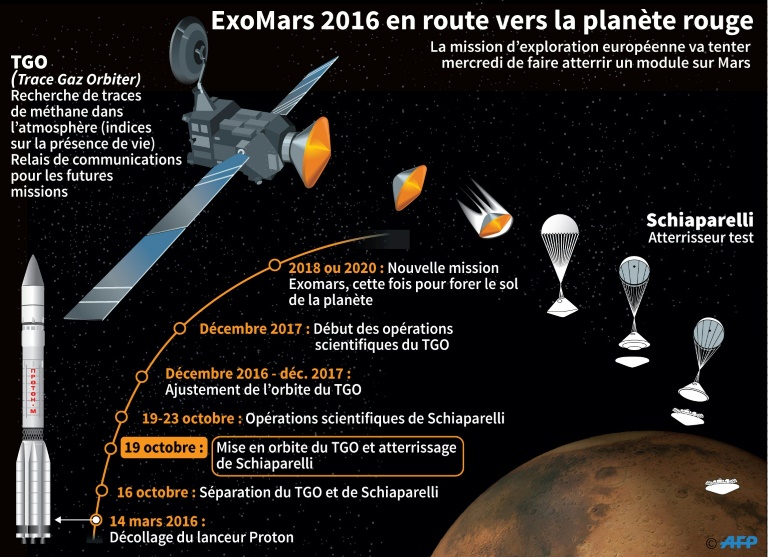 TGO et Schiaparelli, nommé en honneur de l'astronome italien du XIXè siècle, ont parcouru près de 500 millions de kilomètres depuis leur lancement en mars par une fusée russe Proton depuis Baïkonour (Kazakhstan).