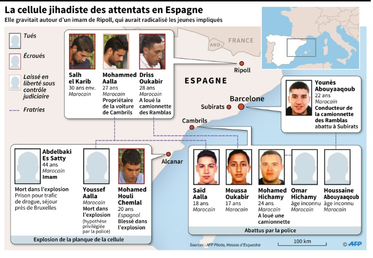 La cellule jihadiste responsable des attentats en Catalogne semble s'être formée en circuit fermé autour d'un "gourou", un modèle ancien qui a réussi à tromper la vigilance policière en évitant l'usage des nouvelles technologies, selon les experts.