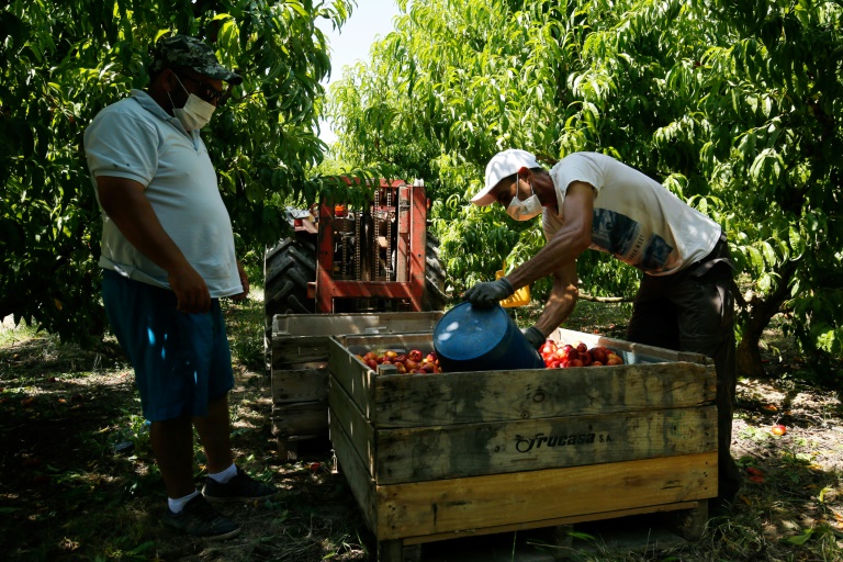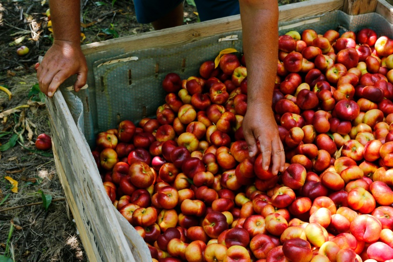 Lui-même fait visiter sa "modeste exploitation de 23 hectares": installés là toute l'année, dix Bulgares - dûment masqués et distancés - y cueillent des nectarines plates destinées à l'Allemagne.