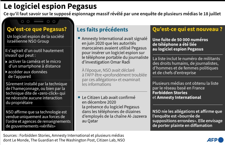 Introduit dans un smartphone, ce logiciel permet d'en rĂ©cupĂ©rer les messages, photos, contacts et mĂȘme d'Ă©couter les appels de son propriĂ©taire. L'enquĂȘte qui renforce les soupçons pesant de longue date sur cette sociĂ©tĂ©, publiĂ©e dimanche par un consortium de 17 mĂ©dias internationaux, se fonde sur une liste obtenue par le rĂ©seau basĂ© en France Forbidden Stories ("histoires interdites") et l'ONG Amnesty International, comptant selon eux 50.000 numĂ©ros de tĂ©lĂ©phone sĂ©lectionnĂ©s par les clients de NSO depuis 2016 pour une surveillance potentielle.