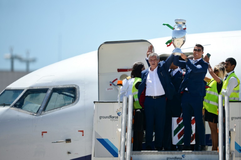Cristiano Ronaldo et Fernando Santos brandissant la coupe en sortant de l'avion à Lisbonne, sous les vivats de la foule: très attendus, les héros de tout un peuple sont rentrés lundi dans un pays qui va pouvoir enfin célébrer la victoire à l'Euro-2016.