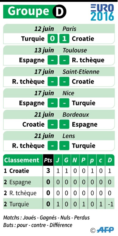 Le double tenant du titre, l'Espagne, qui se lancera lundi (15H00) contre la RĂ©publique TchĂšque Ă Toulouse, est prĂ©venue: la tĂȘte du groupe D sera dure Ă aller chercher face Ă la talentueuse Croatie.