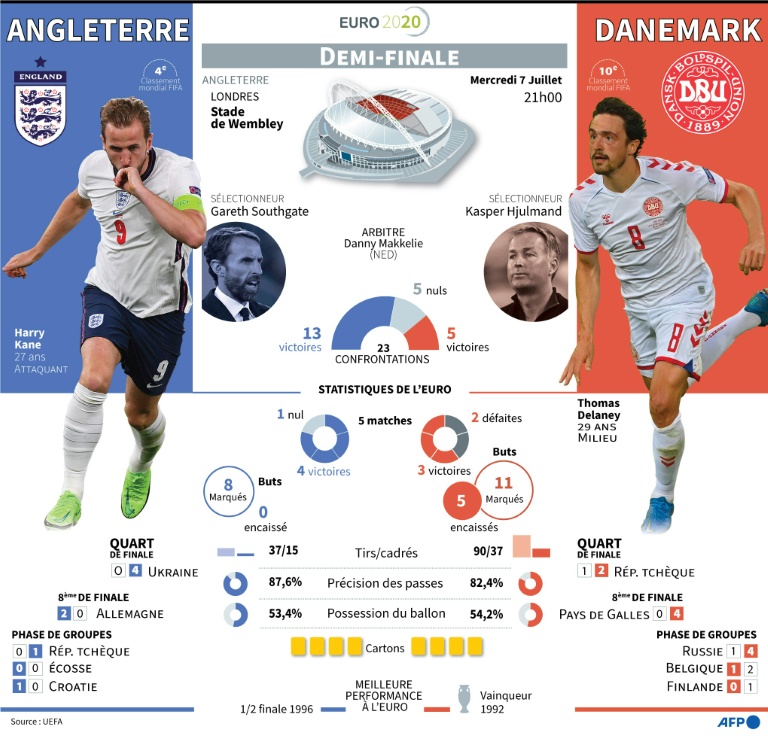 Après deux échecs en demi-finale en 1968 et 1996, les Anglais croient en leur destin après un parcours quasiment impeccable dans cet Euro. "Plus on avance, plus on attend de nous qu'on gagne, on doit être performant sous la pression", a prévenu le capitaine anglais Harry Kane.