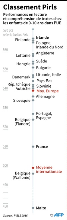 Cette enquête Pirls, réalisée tous les cinq ans depuis 2001 dans 50 pays, montre qu'avec un résultat de 511 points, contre 520 en 2011, les élèves français en classe de CM1 sont désormais nettement distancés par rapport à la moyenne des pays de l'Union européenne (540).