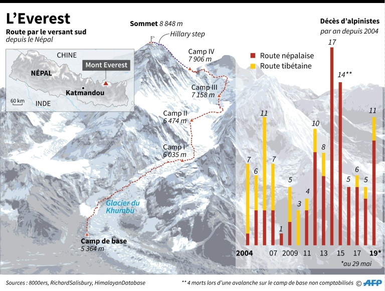 Le nombre réduit des fenêtres météo favorables cette année a fait que les expéditions se sont toutes précipitées au même moment sur le sommet, provoquant d'impressionnants embouteillages dans la "zone de la mort" dont les images ont fait le tour du monde.