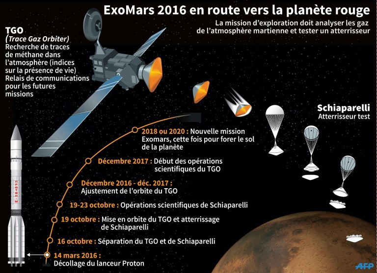 La mission russo-européenne ExoMars 2016 est entrée en orbite lundi, entamant la première partie de son long voyage depuis le cosmodrome de Baïkonour vers la planète rouge, où elle doit trouver de potentielles preuves d'activités biologiques à sa surface.