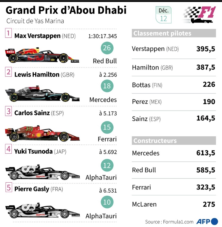 C'est un sacre à son image: avec un panache frôlant l'inconscience et un soupçon de controverses, Max Verstappen est devenu champion du monde de F1 dimanche à Abou Dhabi en dépassant dans le dernier tour Lewis Hamilton, dont l'écurie Mercedes multiplie les recours contre cet incroyable dénouement.