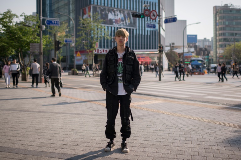 Cheveux teints en blond, arborant des boucles d'oreille, le musicien passe l'après-midi avec des amis à Sinchon, quartier universitaire animé de Séoul.