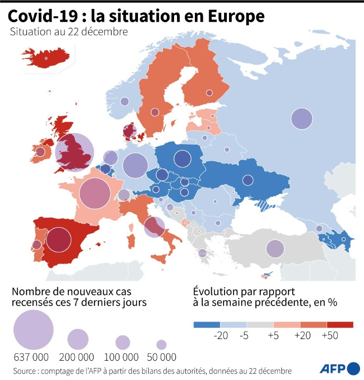 Première région concernée, l'Europe - épicentre actuel de la pandémie - fait face à des niveaux de contaminations inédits: plus de 4,9 millions d'infections ont été enregistrées ces sept derniers jours, soit 59% de plus que la semaine précédente, selon un comptage de l’AFP samedi. Au total, plus de 100 millions de cas y ont été recensés depuis la découverte du virus en décembre 2019.