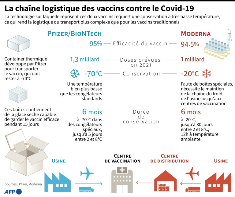 Le premier type, particulièrement difficile à transporter, "va concerner jusqu'à 30% des doses qui seront distribuées dans le monde", estime Mathieu Friedberg, directeur général du logisticien Ceva (groupe CMA-CGM). Pour les 70% du second type, "c'est des logistiques toujours spécifiques. Ca reste de la pharma et donc c'est sensible, mais c'est moins technique que le -80°C", dit-il.