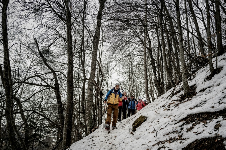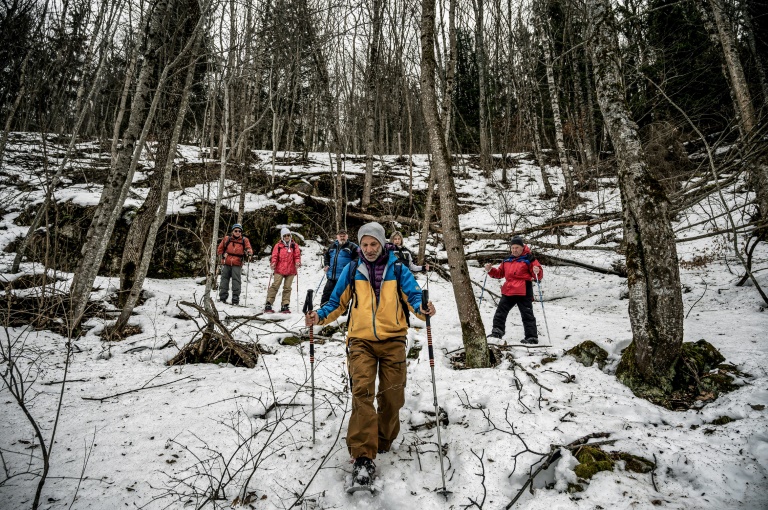 Laurent Ficheur mène sa petite troupe en raquettes à neige dans la forêt des Deux Alpes, en Isère, sur une neige croutée et abimée par la pluie tombée trop haut ces derniers jours.