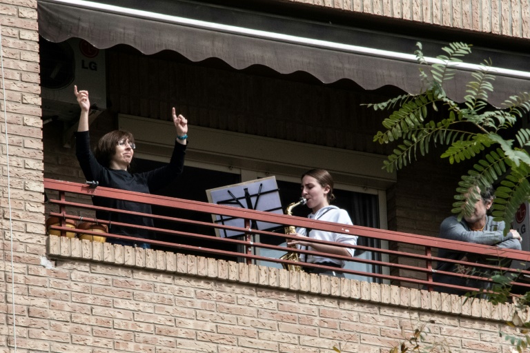 A Madrid, où les rues habituellement grouillantes de monde sont quasiment désertes, des habitants trompent l'angoisse en jouant chaque soir de la musique aux balcons, ou organisent des parties de loto avec le voisinage, en criant les numéros d'une fenêtre à l'autre.