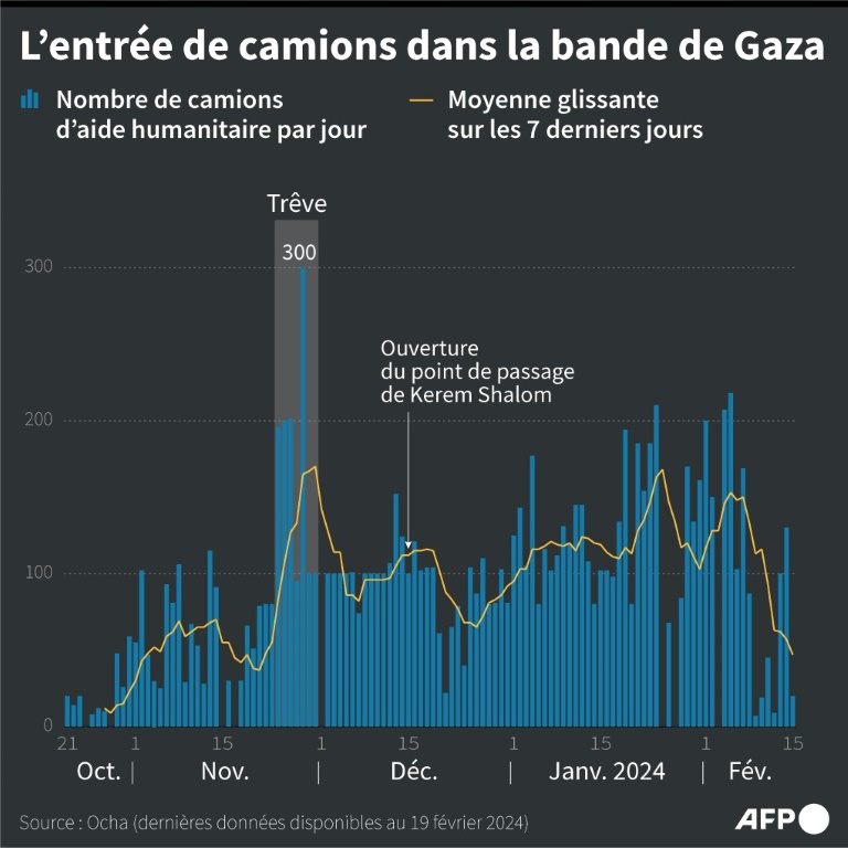 L'inquiétude grandit en particulier à Rafah, à la frontière fermée avec l'Egypte, où se massent dans des conditions précaires au moins 1,4 million de personnes, la plupart des déplacés, qui sont menacées d'une opération militaire terrestre d'envergure.