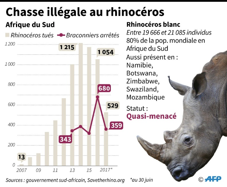 L'Afrique du Sud abrite quelque 20.000 rhinocéros, soit 80% de la population mondiale, mais elle est le théâtre d'un braconnage qui a atteint des records au cours des dernières années. Plus de 7.100 de ces pachydermes y ont été tués au cours de la décennie écoulée.