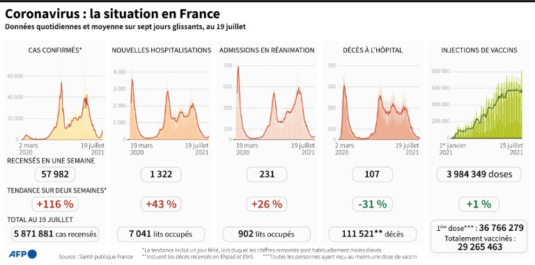 C'est justement cette dégradation au plan national qui a amené le président Emmanuel Macron à annoncer un tour de vis le 12 juillet pour accélérer la vaccination: vaccin obligatoire pour les soignants et extension du pass sanitaire (prouvant la vaccination complÚte, un test négatif récent ou l'immunisation) aux cafés, restaurants ou trains à partir de début août.