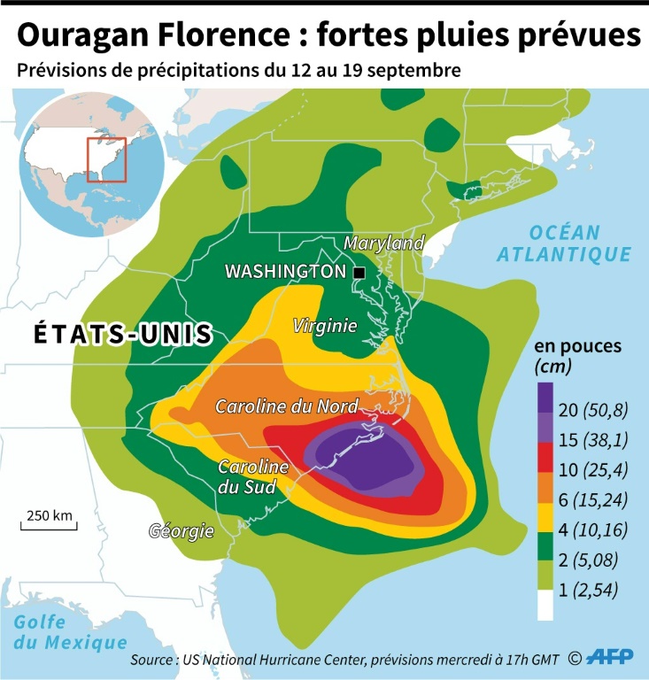 Rétrogradée mercredi d'un cran en une tempête catégorie 2, Florence devrait approcher les côtes de la Caroline du Nord et de la Caroline du Sud jeudi soir et vendredi, mais chacun se demande s'il va être dans la partie la plus violente de l'ouragan, dont la trajectoire est incertaine.