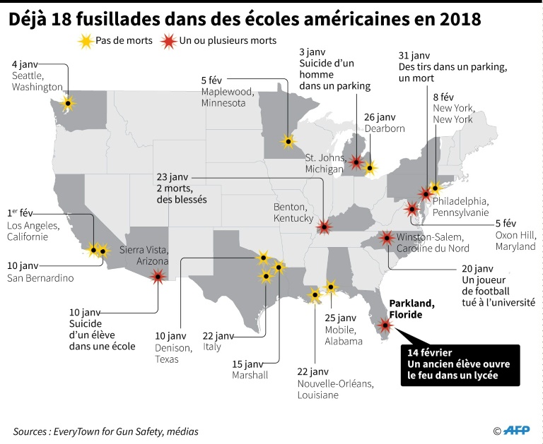 Prenant la mesure de l'émotion dans le pays, il a peu après ordonné que les drapeaux soient mis en berne. Il doit s'adresser au pays à 16H00 GMT. Comme en écho, le sénateur républicain de Floride Marco Rubio a martelé que "ceci pourrait arriver n'importe où". "Il s'agit de quelqu'un dont les gens savaient qu'il représentait un danger, quelqu'un sur qui on plaisantait dans l'école (...) pour dire qu'il reviendrait un jour et ferait du mal à beaucoup de gens", a-t-il poursuivi sur Fox News. "Et pourtant il est parvenu à ne pas être détecté, a pu acheter cette arme et tuer 17 personnes et en blesser beaucoup plus".