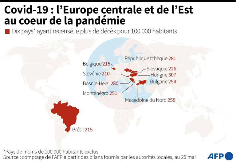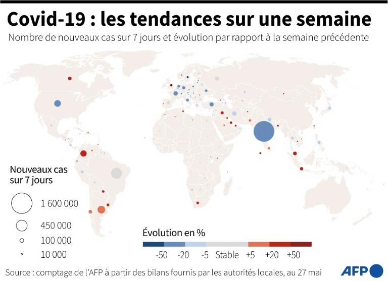 L'Inde est aussi en tête du classement des décès quotidiens (4.016 par jour cette semaine), devant le Brésil (1.797), les Etats-Unis (661), la Colombie (494) et l'Argentine (491). Au niveau mondial, les décès quotidiens ont baissé cette semaine (11.563 par jour, -6%).