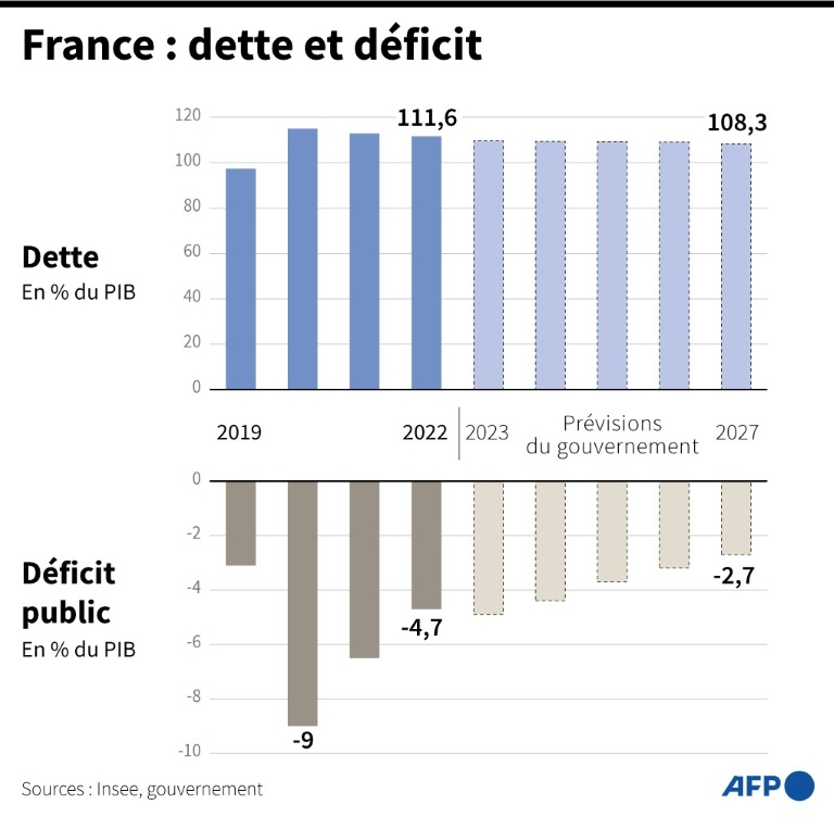 Il s'agit de réduire à 108,3% du PIB en 2027 le lourd endettement du pays (contre 111,6% fin 2022), qui le range du cÎté des mauvais élÚves européens, et de ramener sous l'objectif européen de 3% le déficit public (4,7% fin 2022).