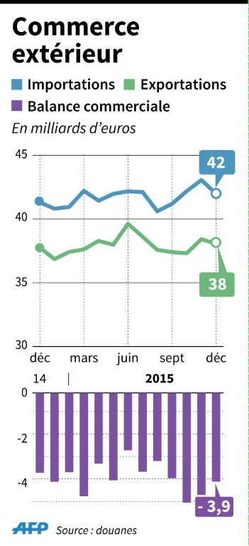 Les importations ont pour leur part augmenté "modérément", de 1,2% (contre un repli de 0,6% en 2014), "tirées vers le bas par la chute des approvisionnements énergétiques due au reflux du prix du pétrole", selon les Douanes. Le prix moyen du baril de brut est passé de 110 dollars à la mi-2014 à 30 USD à la fin 2015.