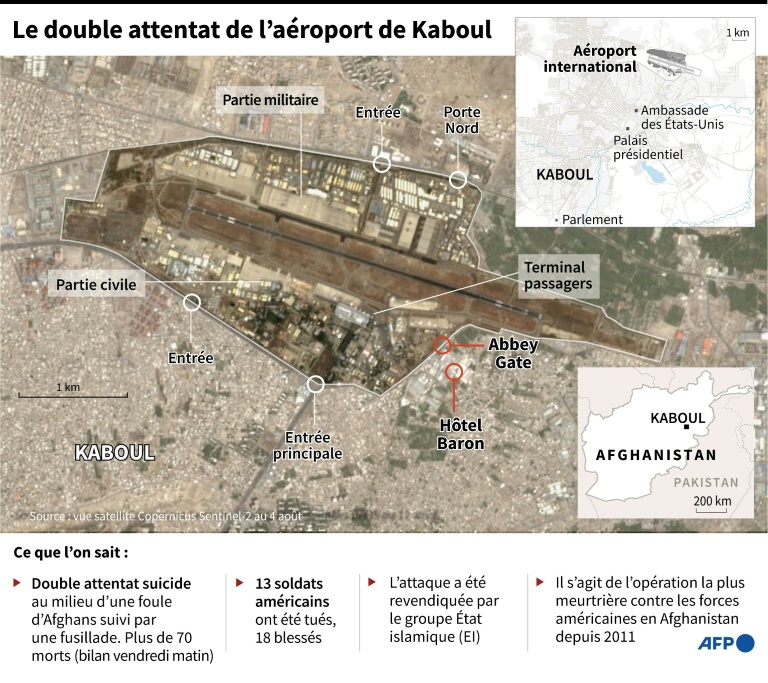 Cette frappe est la première des Etas-Unis depuis l'attentat de jeudi, revendiqué par l’EI, qui a fait plus d'une centaine de morts, dont 13 soldats américains, selon un nouveau bilan établi de sources sanitaires. Deux responsables sanitaires de l'ancienne administration afghane ont indiqué à l'AFP qu'environ 90 personnes amenées dans des hôpitaux de Kaboul étaient décédées, et 150 blessées. Certains médias locaux ont fait état d'un bilan de 170 morts.