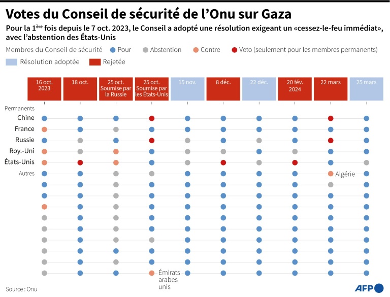 Le Conseil de sécurité de l'ONU a adopté lundi une première résolution appelant à un cessez-le-feu à Gaza, par 14 voix pour et une abstention, celle des Etats-Unis qui avaient jusqu'alors bloqué trois projets de résolution en ce sens.