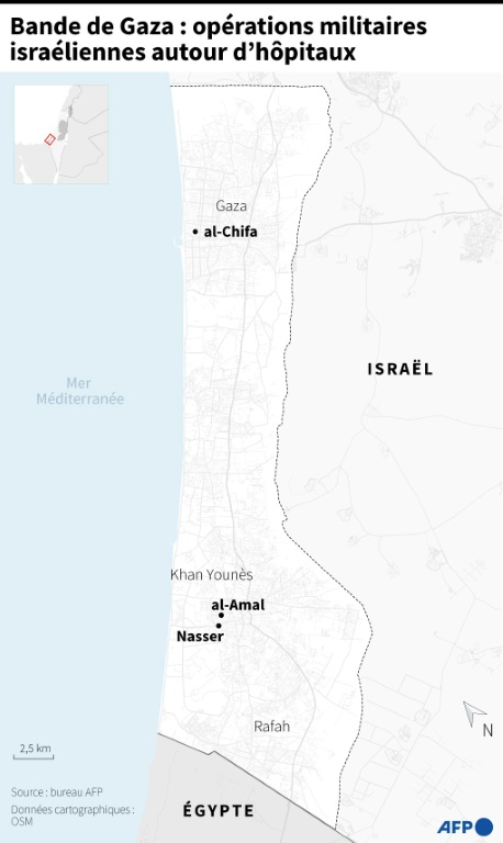 L'armée israélienne, qui accuse les combattants du Hamas de se cacher dans les hôpitaux, poursuit son opération lancée le 18 mars dans le complexe hospitalier al-Chifa de Gaza-Ville. A Khan Younès, les soldats mènent des opérations dans le secteur des hôpitaux Nasser et al-Amal, distants d'environ un kilomètre.