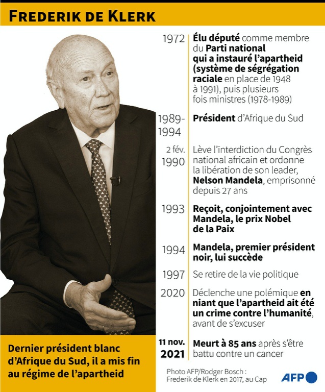 Le dernier président blanc sud-africain Frederik de Klerk, décédé jeudi à l'âge de 85 ans, fut un pur produit du régime raciste de l'apartheid dont il a pourtant précipité la chute en libérant Nelson Mandela, avec qui il a partagé le prix Nobel de la paix.