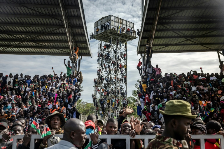 Des milliers de ses partisans ont pris d'assaut le stade Jomo Kenyatta de Kisumu, grande ville de l'Ouest kényan, sur les bords du lac Victoria, où un hélicoptère a déposé le cercueil vers 8H45 (5H45 GMT), ont constaté des journalistes de l'AFP.