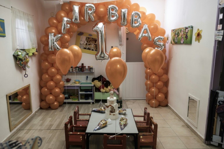 A Nir Oz, un kibboutz proche de Gaza, le collectif organise un anniversaire symbolique pour le plus jeune otage, Kfir Bibas, enlevé alors qu'il avait près de neuf mois et dont l'anniversaire tombe jeudi.