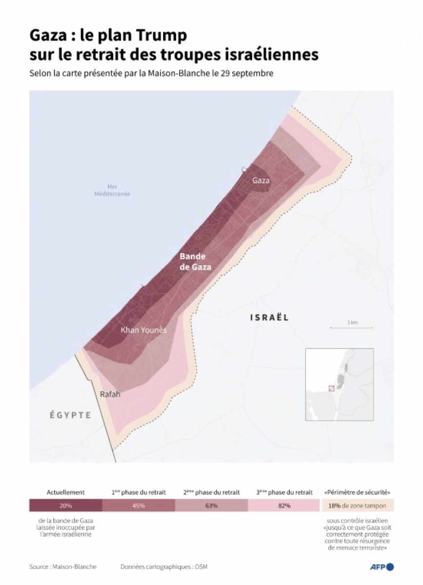Le plan américain prévoit un cessez-le-feu, la libération dans les 72 heures des otages, le retrait par étapes de l'armée israélienne de Gaza, le désarmement du Hamas et l'exil de ses combattants.