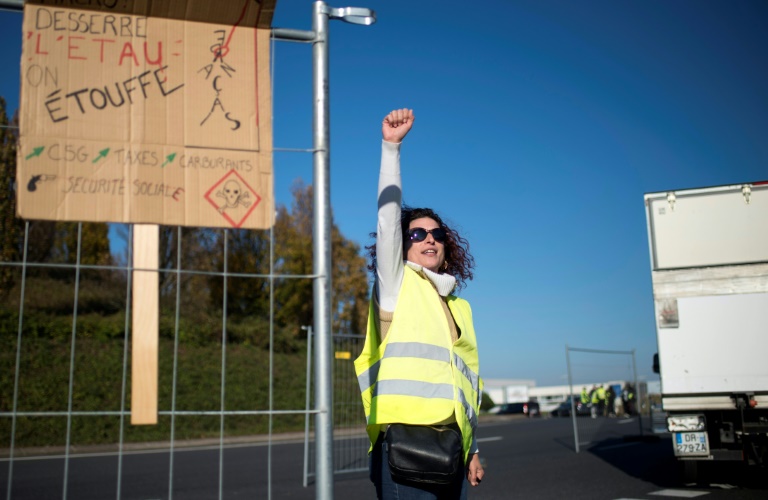 "Macron desserre l'étau, on étouffe", pouvait-on lire sur une banderole dans la banlieue de Nantes, à proximité de la principale zone commerciale de cette ville de l'ouest. Environ 150 "gilets jaunes" y occupaient un rond-point, arrêtaient les voitures et demandaient aux conducteurs de mettre un gilet jaune pour les laisser passer.