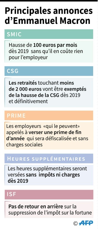D'où des annonces qui ne pèsent ni sur les plus fortunés ni sur les entreprises. La mesure phare, la hausse pour les salariés au Smic, sera financée par une prime d'activité versée par l'État. C'est également l'État qui paiera l'exonération de la hausse de CSG pour les retraites inférieures à 2.000 euros et la défiscalisation des heures supplémentaires, une mesure déjà adoptée en 2007 par Nicolas Sarkozy avec lequel M. Macron a déjeuné vendredi.