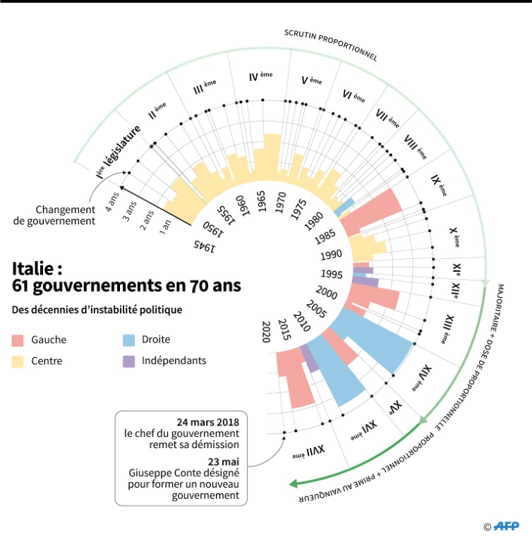 Mais c'est surtout avec le Mouvement Cinq Etoiles (M5S, antisystème) et la Ligue (extrême droite) que ce juriste de 53 ans, totalement inconnu en Italie il y a encore quelques jours, négocie la composition du 65e gouvernement italien depuis 1946.