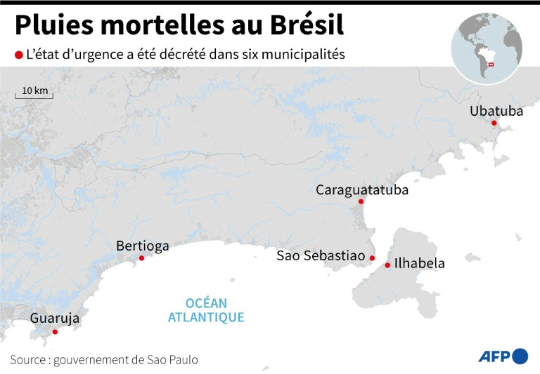 Plus de 680 millimètres de pluie sont tombés en 24 heures à Sao Sebastiao, station balnéaire à environ 200 km de Sao Paulo, soit plus du double que les précipitations mensuelles. Un record national selon le gouvernement de l'Etat de Sao Paulo.
