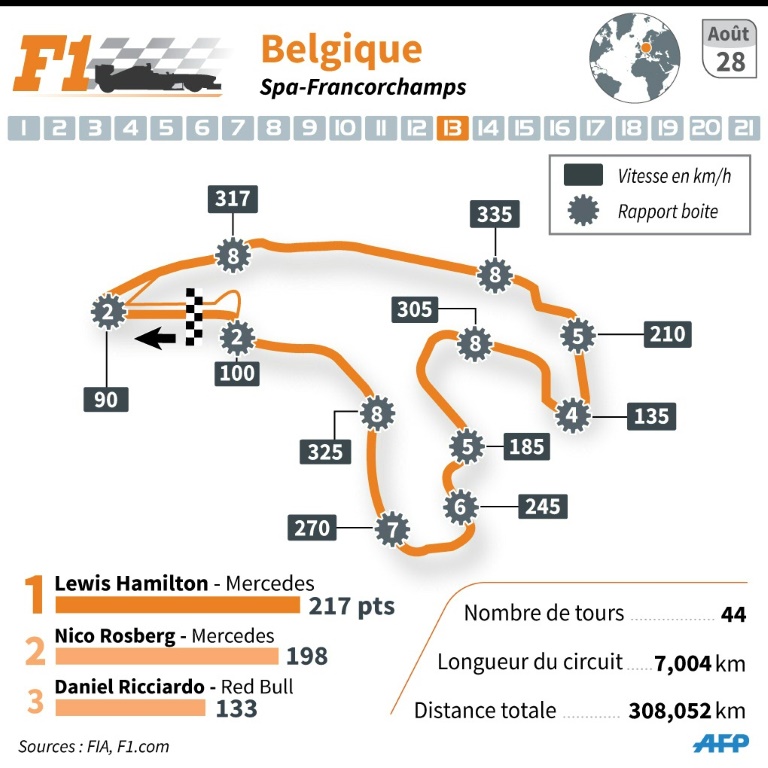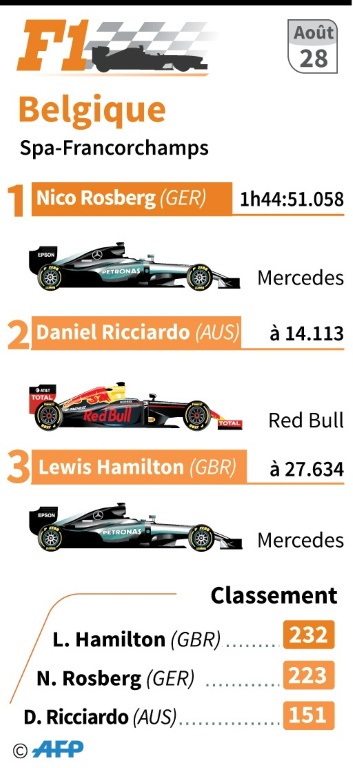 L'Allemand Nico Rosberg (Mercedes), parti en pole position, a remporté le Grand Prix de Belgique de Formule 1, dimanche à Spa-Francorchamps, devant l'Australien Daniel Ricciardo (Red Bull) et l'Anglais Lewis Hamilton, parti 21e sur la grille.