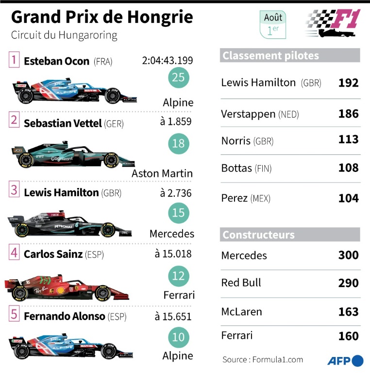 Il tient lui aussi son moment de gloire: Esteban Ocon (Alpine), après Pierre Gasly en 2020, a remporté le premier Grand Prix de sa carrière à 24 ans, le deuxième seulement du XXIe siècle pour un Français, après une course rocambolesque en Hongrie.