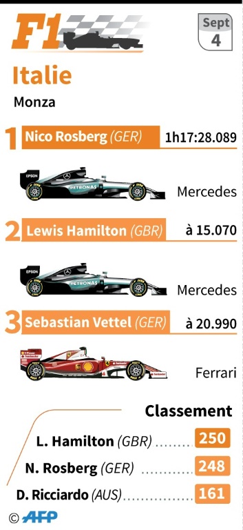 Grâce à deux victoires d'affilée, en Belgique puis en Italie, Nico Rosberg (Mercedes) revient à deux points de son rival préféré, Lewis Hamilton, toujours en tête du Championnat du monde de Formule 1 malgré un départ raté, dimanche à Monza.