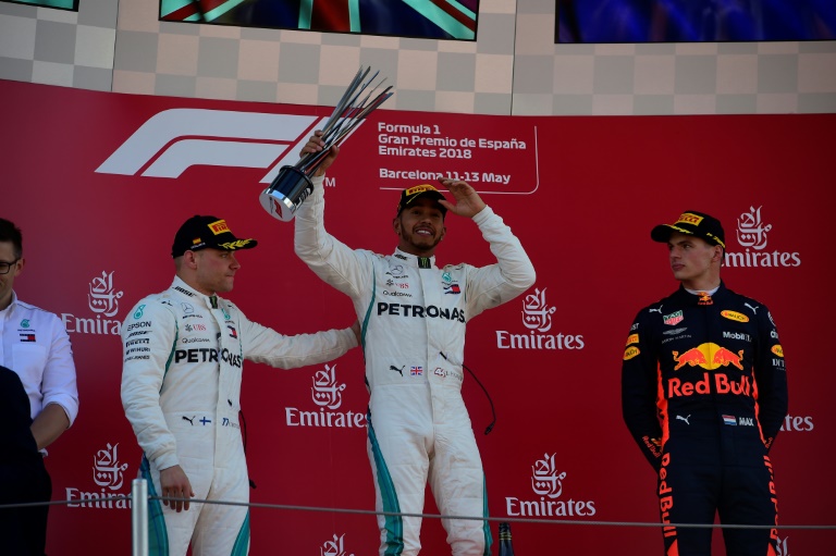 Le second pilote Mercedes, le Finlandais Valtteri Bottas, et le Néerlandais Max Verstappen (Red Bull) accompagnent sur le podium un Hamilton en quête, comme Vettel, d'un cinquième titre mondial, pour égaler l'Argentin Juan Manuel Fangio.