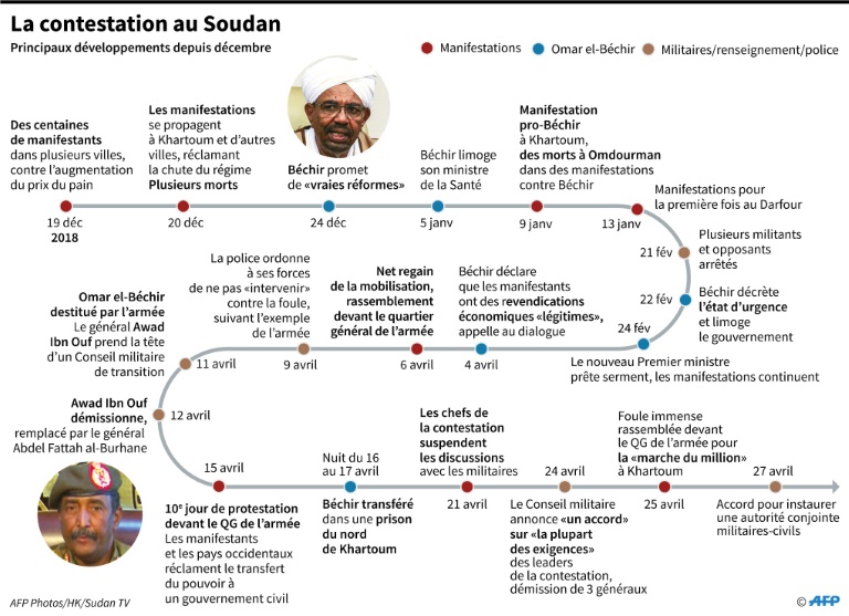 Après la destitution le 11 avril du président Omar el-Béchir par l'armée sous la pression d'un mouvement de contestation inédit lancé en décembre, un Conseil militaire de transition a pris le pouvoir pour deux ans.