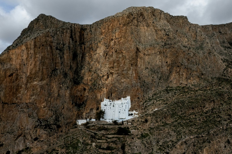 "Ici, c'est le meilleur endroit pour partir un peu plus vite au ciel", sourit le bénévole Constantin Papakonstantinou en désignant l'immensité de la mer Egée au pied du monastère.