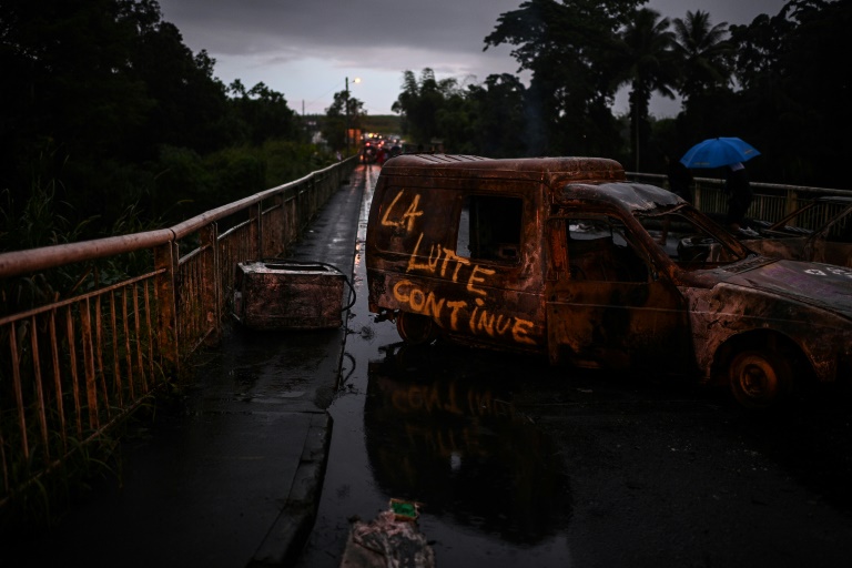 Des carcasses de voitures brûlées, des débris en tous genres parfois enflammés ou encore une benne à ordures renversée bloquent l'entrée du pont, qui enjambe la Grande Rivière, plus long cours d'eau de l'île, à Goyave. Seul point d'accès par le sud à Sainte-Rose, commune de la Basse Terre qui se retrouve enclavée (l'entrée par le nord est également barrée), le passage est surveillé par des hommes pour certains cagoulés.