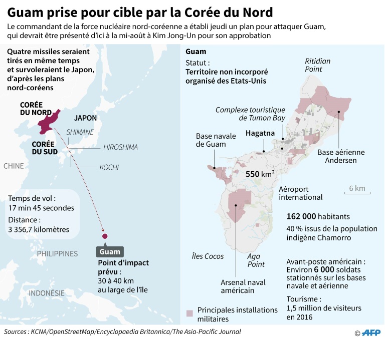Pyongyang a rendu public son plan détaillé pour tirer quatre missiles vers Guam. Mais cela fait longtemps que la Corée du Nord multiplie les menaces et les 162.000 habitants, dont les vies se mêlent étroitement à celles des 6.000 soldats américains déployés sur l'île, en ont conçu une forme de résilience.