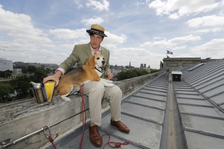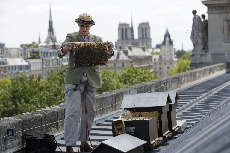 De là -haut, le regard porte loin vers la Tour Eiffel et Montparnasse. "J'ai de la chance, mon bureau est dans le ciel", sourit l'apiculteur, 34 ans, qui troque souvent la combinaison blanche professionnelle contre un simple chapeau de paille recouvert d'un filet de protection. Il a baptisé son entreprise "Le miel de Paris".